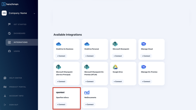 - Go to 'Integrations' and click on + Connect OpenText eDocs.