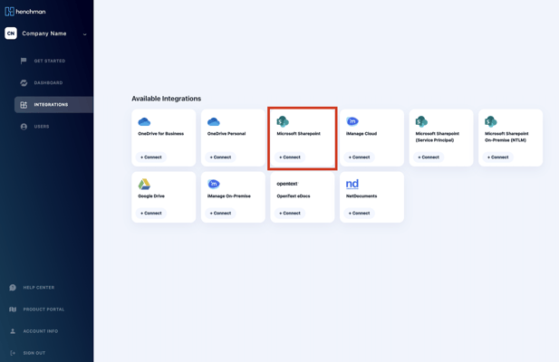 - Go to Integrations and select Connect for Microsoft Sharepoint