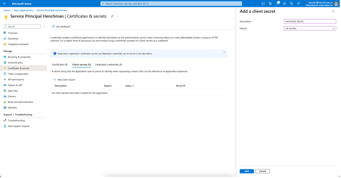 • Click "new client secret" and select "Expires: 24 months"