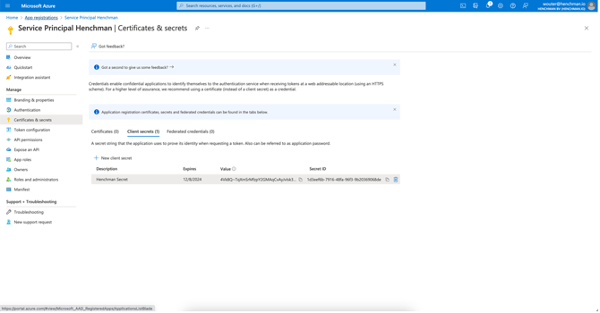 • Go to "Certificates & Secrets" , then "client secrets"