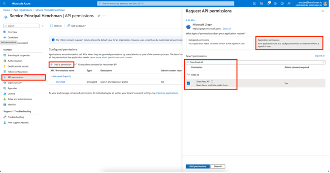 ❗️Be sure to also grant permissions to the service principal for the relevant sites as specified in this microsoft blogpost. Assigning permissions to a service principal is not possible through the Azure UI, only through REST API calls.
