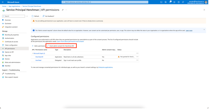 Once this happened, click "Grant admin consent for {name}" on the permissions page